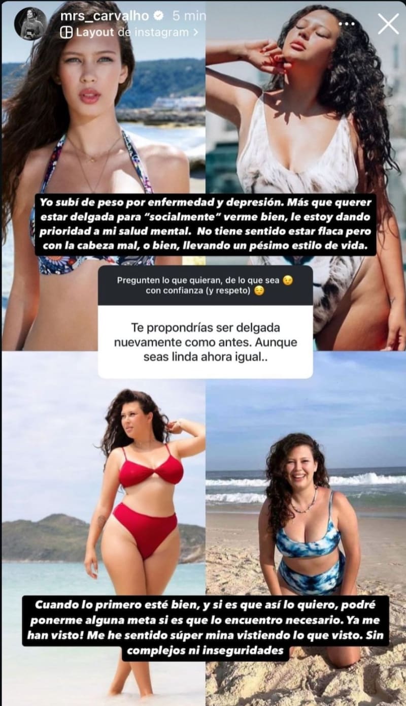 Michelle Carvalho compartió una importante reflexión al contestar a un usuario que le preguntó sobre la posibilidad de bajar de peso y de “volver a ser delgada”.