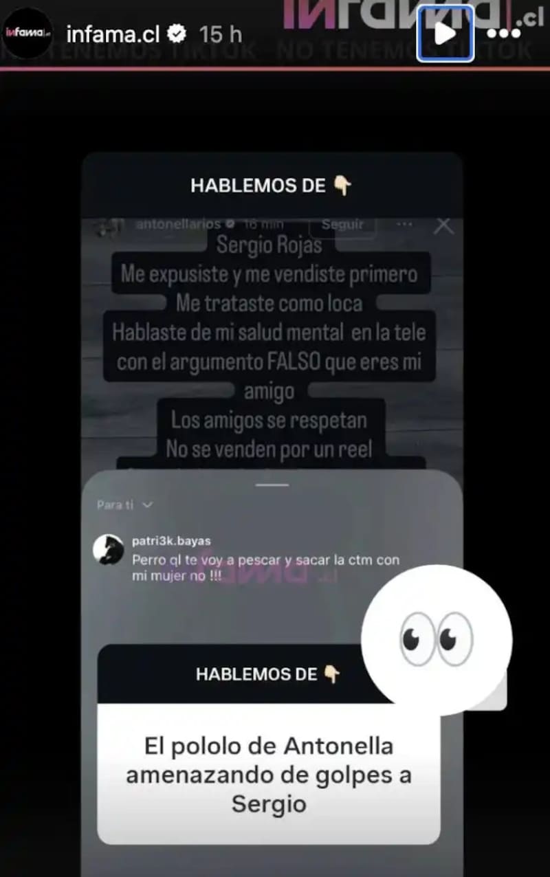 Sin embargo, lo que llamó la atención de la publicación no fue solo el mensaje de la actriz, sino que el sitio Infama se percató de que el pololo de Antonella dejó un comentario, amenazando a Sergio Rojas.