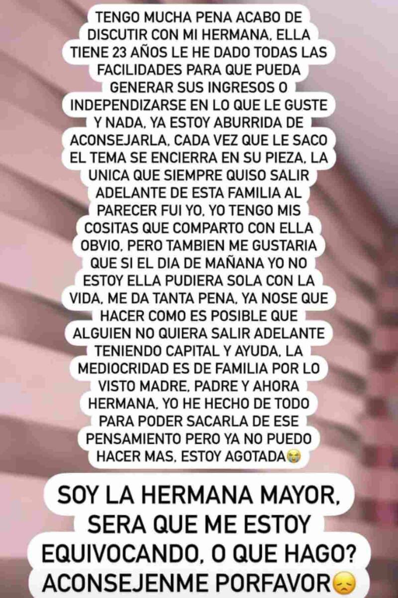 La influencer tuvo una fuerte discusión con su hermana y a través de su cuenta de Instagram reveló detalles del enfrentamiento entre ambas.
