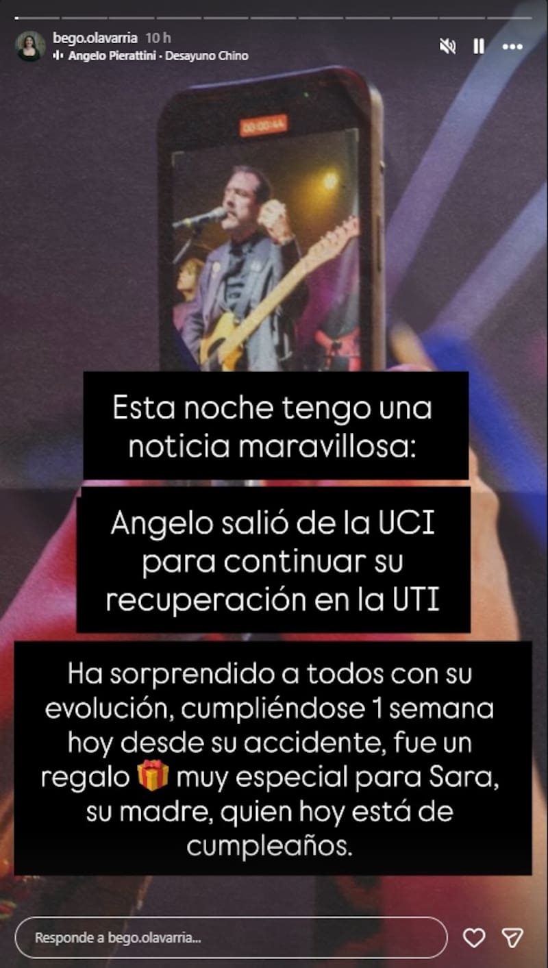 La noche de este lunes, la esposa de Angelo Pierattini, Begoña Olavarría, sorprendió a los seguidores del músico con una esperanzadora actualización tras el grave accidente que sufrió el artista.