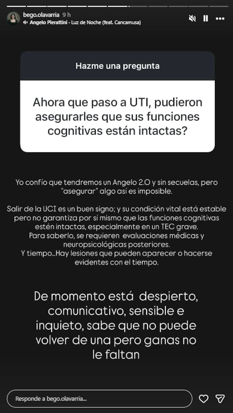 Ante esto, la esposa de Pierattini respondió que “yo confío que tendremos un Angelo 2.0 y sin secuelas, pero ‘asegurar’ algo así es imposible”.