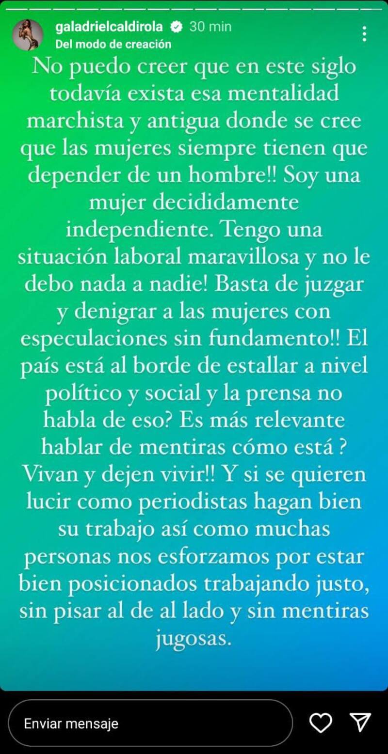 “Basta de juzgar y denigrar a las mujeres con especulaciones sin fundamento!! El país está al borde de estallar a nivel político y social y la prensa no habla de eso? Es mas relevante hablar de mentiras como esta? Vivan y dejen vivir!!”, arremetió Gala Caldirola.