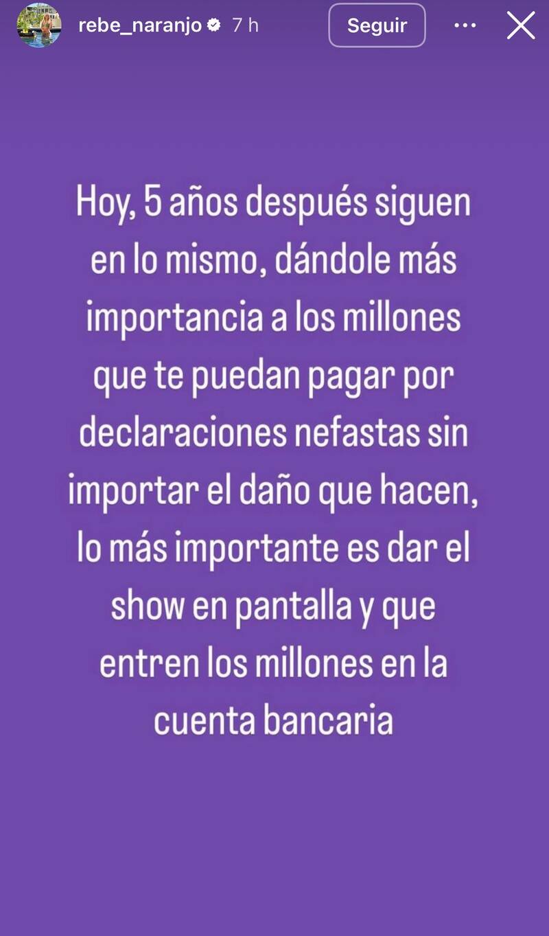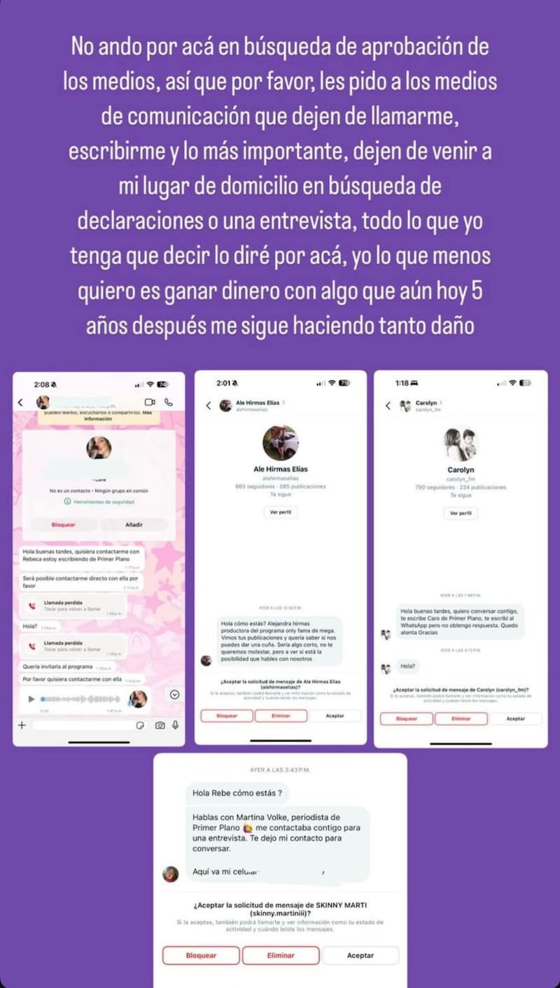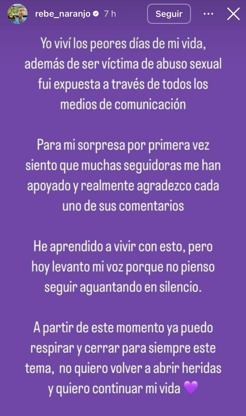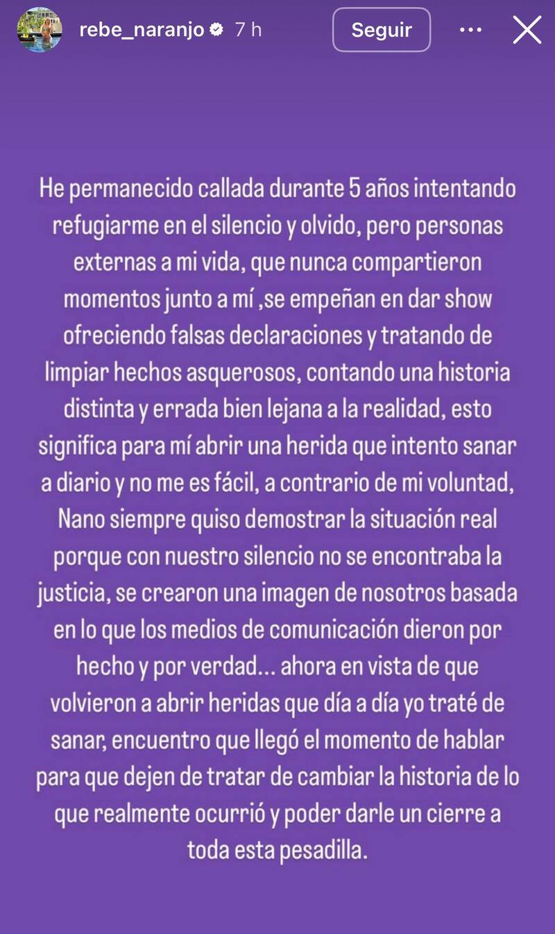 “He permanecido callada durante 5 años, intentando refugiarme en el silencio y olvido, pero personas externas a mi vida, que nunca compartieron momentos junto a mí, se empeñan en dar show ofreciendo falsas declaraciones y tratando de limpiar hechos asquerosos, contando una historia distinta y errada bien lejana a la realidad”, escribió de entrada a través de su cuenta de Instagram.