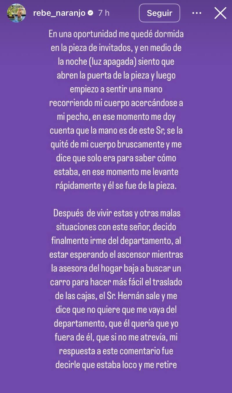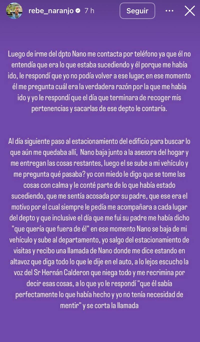 En otras historias, Rebeca reveló que “en otra ocasión, sentados en la mesa Hernán Calderón Salinas, su pareja Patricia, Nano y yo, empezamos a hablar de mi negocio de venta de bikinis, en eso él me pregunta cuál era el modelo más vendido, a lo que yo respondí que el modelo más vendido era el tipo colaless. Luego de mi respuesta, Hernán Calderón Salinas me dice ‘que me pruebe uno a ver qué tan pequeños eran’. Ante esto, su pareja Patricia le llama la atención por el comentario, y Nano le dice que es un comentario inapropiado”.