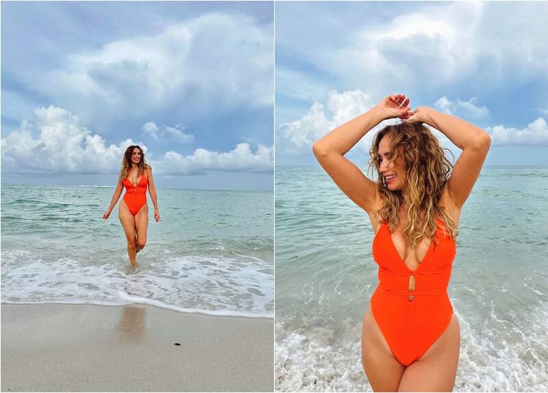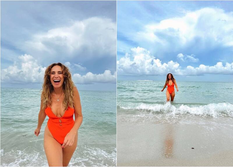 La reconocida actriz subió a su cuenta de Instagram varias instantáneas vistiendo un coqueto traje de baño naranjo.