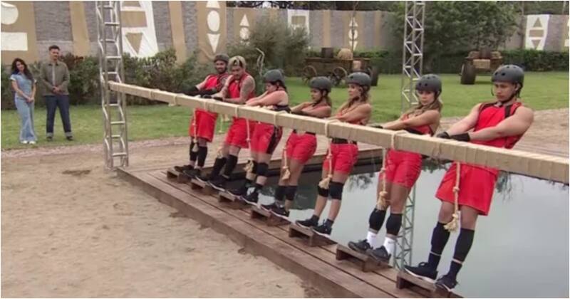 La competidores debieron enfrentar una breve pero intensa prueba de residencia. Los del equipo rojo, denominado “Puro Fuego”, debían aferrarse a una cuerda que sostuviera el peso de sus cuerpos, hasta caer el agua.