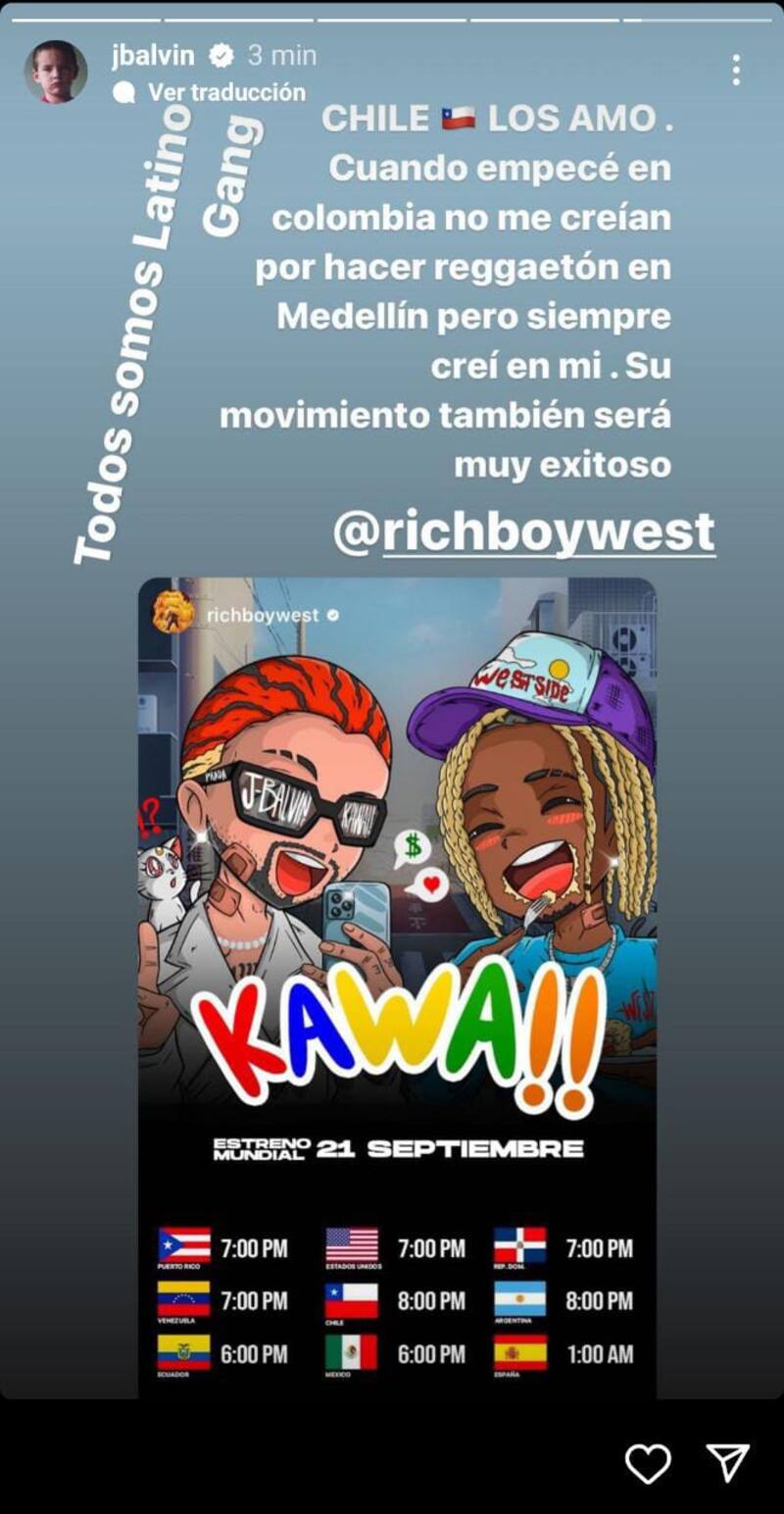 El colombiano por su parte también le mandó un emotivo mensaje al artista nacional. “Chile los amo. Cuando empecé en Colombia, no me creían por hacer reggaetón en Medellin, pero siempre creí en mí, su movimiento también será muy exitoso. Todos somos Latino gang”, sentenció.