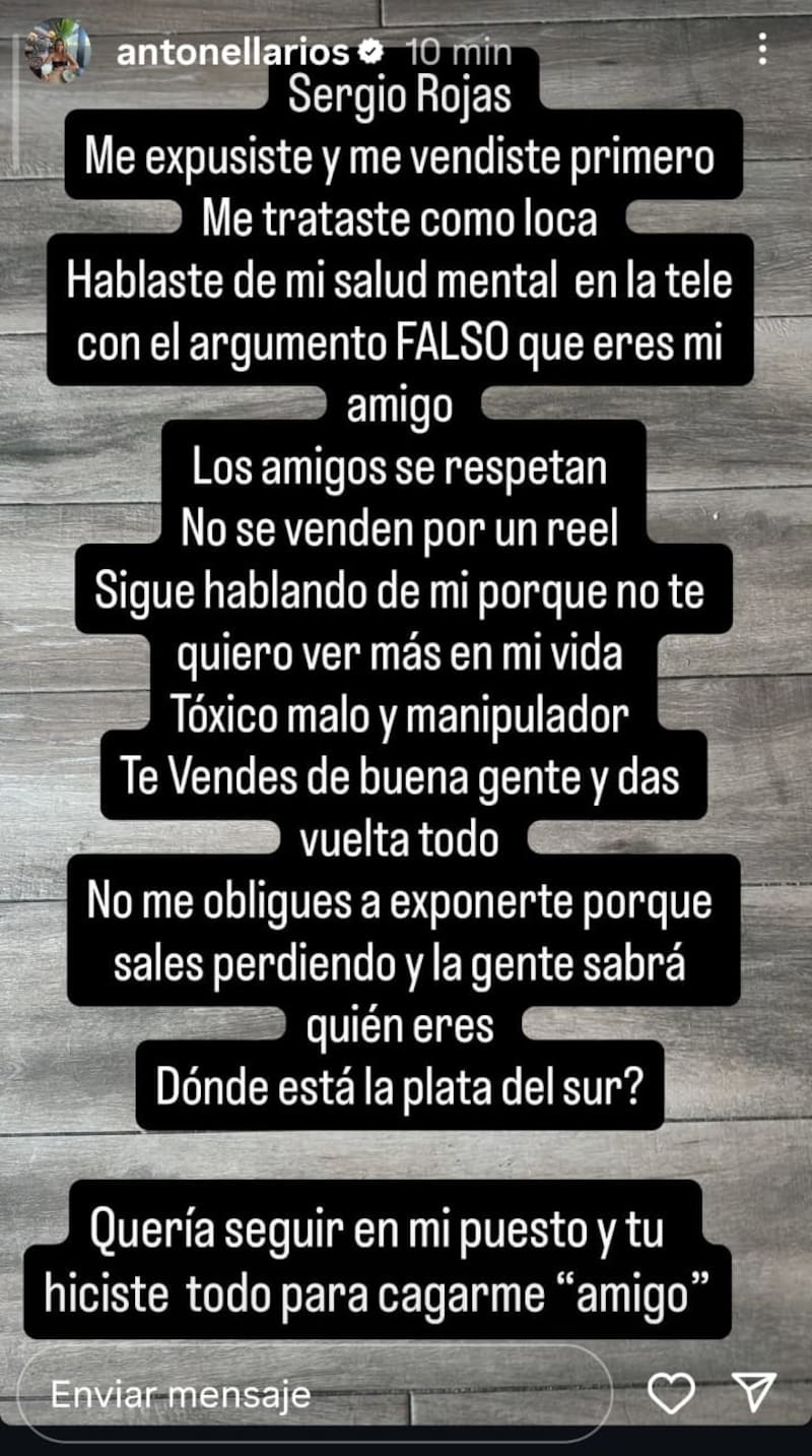 “Sergio Rojas me expusiste y me vendiste primero. Me trataste como loca, hablaste de mi salud mental en la tele con el argumento falso que eres mi amigo”, lanzó.