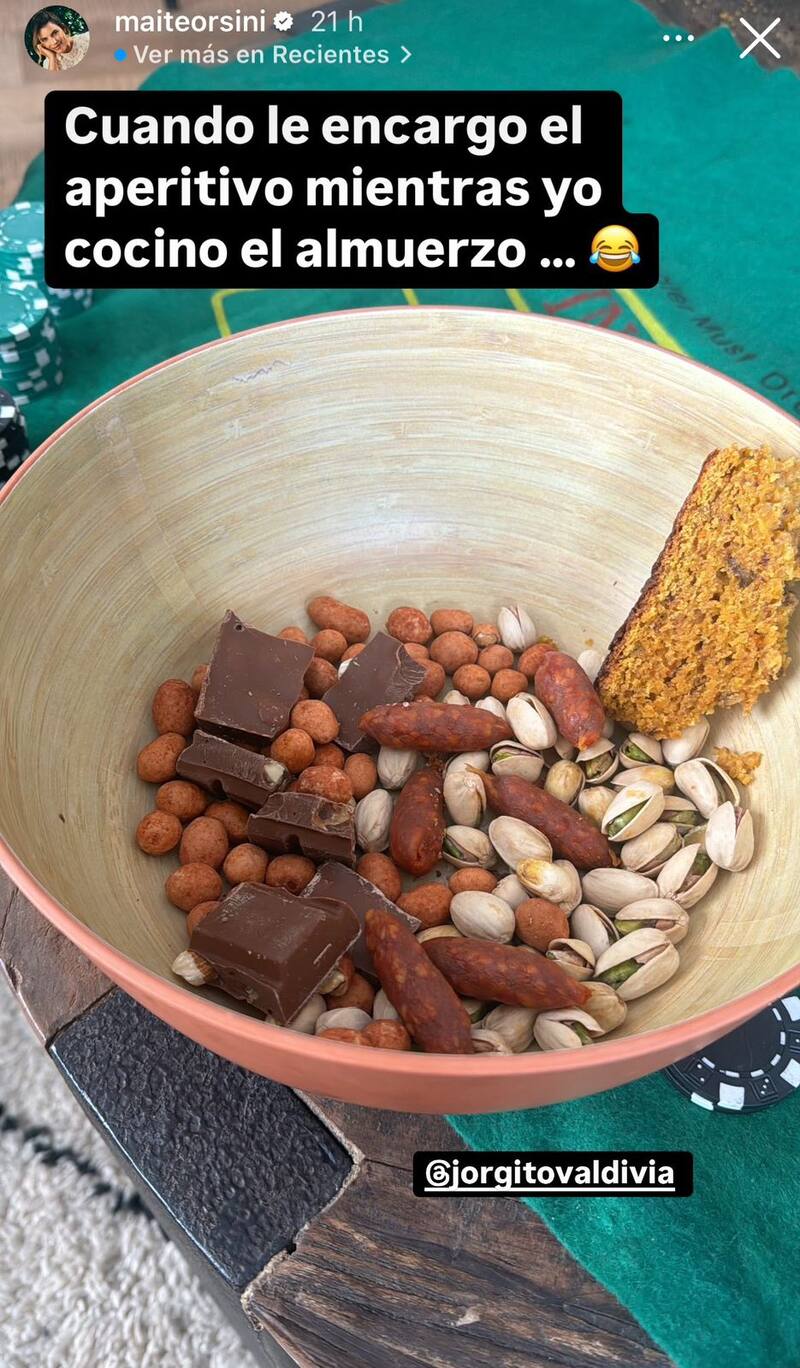 En concreto, Orsini quiso destacar las habilidades culinarias de su enamorado. Y para eso, subió una preparación realizada por Valdivia, un bowl con varios tipos de alimento en su interior, como maní japonés, mini chorizos, pistachos y chocolate.