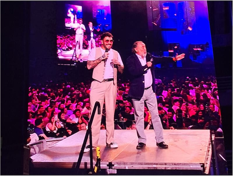 Se remonta a sus primeros años como comediante, cuando mezclaba las risas con la magia, y homenajea a su esposa, Catalina Ponce: “Estuvo (conmigo) cuando habían veinte personas, y ahora que hay once mil”, destaca y le agradece a quien se encuentra sentada en primera fila.
