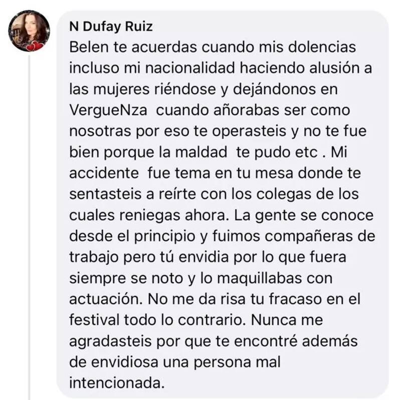 “Belén, te acuerdas cuando mis dolencias, incluso mi nacionalidad, haciendo alusión a las mujeres, riéndose y dejándonos en vergüenza. Cuando añorabas ser como nosotras, por eso te operaste y no te fue bien porque la maldad te pudo”, comenzó diciendo.