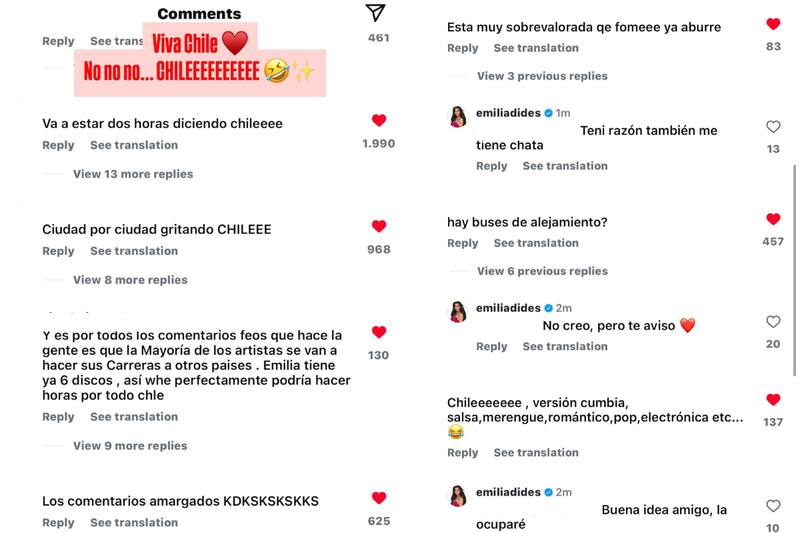 “Va a estar dos horas diciendo Chile”, “ciudad por ciudad gritando Chile” y “Chile versión cumbia, merengue, romántico, pop, electrónica, etc.”, fueron solo algunos de los comentarios que inundaron sus publicaciones. Otros fueron más duros: “Está muy sobrevalorada”, “ya aburre”, “¿Hay buses de alejamiento?”.