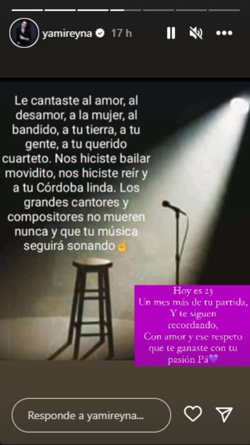 “Hoy es 23. Un mes más de tu partida, y te siguen recordando. Con amor y ese respeto que te ganaste con tu pasión Pá”, agregó Yamila Reyna.