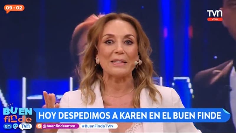 El capítulo de este sábado de Buen Finde comenzó la emotiva despedida en pantalla de Karen Doggenweiler, quien anunció este viernes que dejará TVN tras 31 años en el canal.