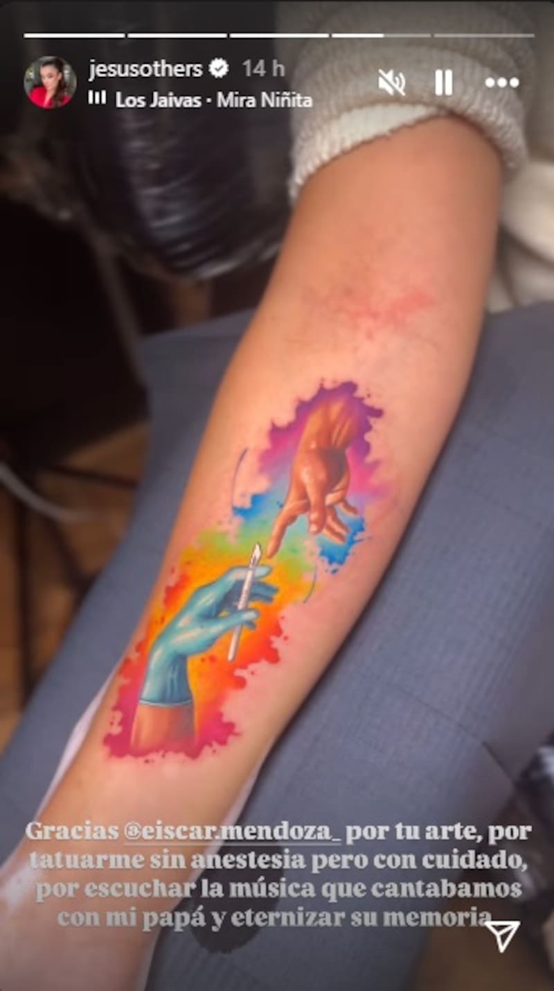 Luego, María Jesús mostró los resultados y agradeció a su tatuador por “tu arte, por tatuarme sin anestesia, pero con cuidado, por escuchar la música que cantábamos con mi papá y eternizar su memoria”.