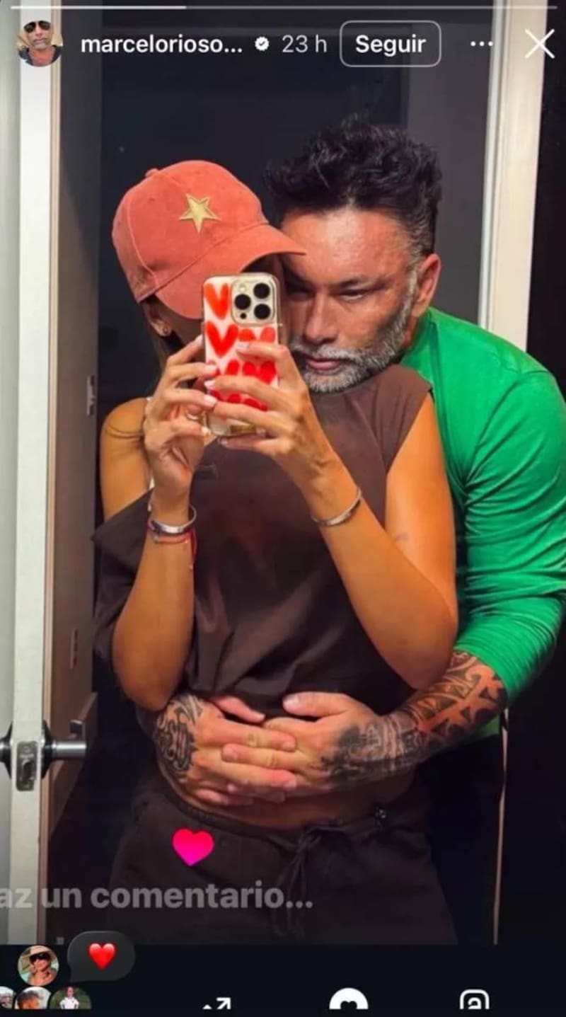 Ella aparece con el rostro tapado por su teléfono celular mientras captura el momento. ¿Y Ríos? Detrás, casi como una extensión de su cuerpo, con el mentón apoyado sobre su hombro y rodeándola con las manos a la altura del vientre.