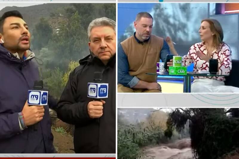 El meteorólogo Jaime Leyton y el periodista Andrés Caniulef llegaron esta mañana hasta la ribera del río Mapocho en la comuna de Lo Barnechea, para mostrar la peligrosa crecida del caudal producto de las lluvias.