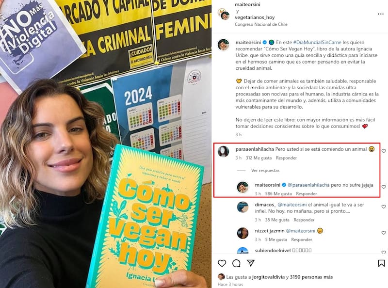 “Dejar de comer animales es también saludable, responsable con el medio ambiente y la sociedad”, expresó en su post. “Con mayor información es más fácil tomar decisiones conscientes sobre lo que consumimos”, agregó.