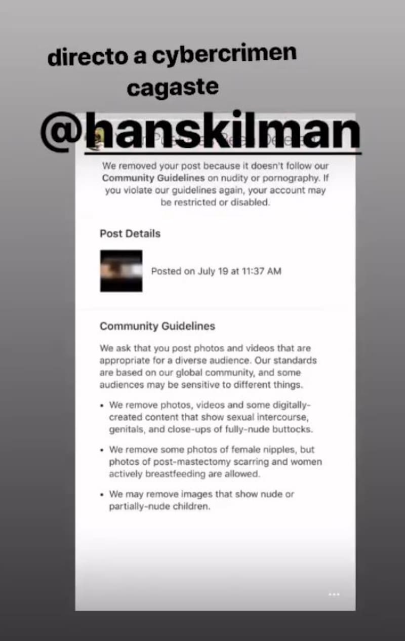 Entre las diversas caputras que subió Valentina Roth, muestra como el video fue borrado en Instagram por ser contenido inapropiado según las reglas de la plataforma.