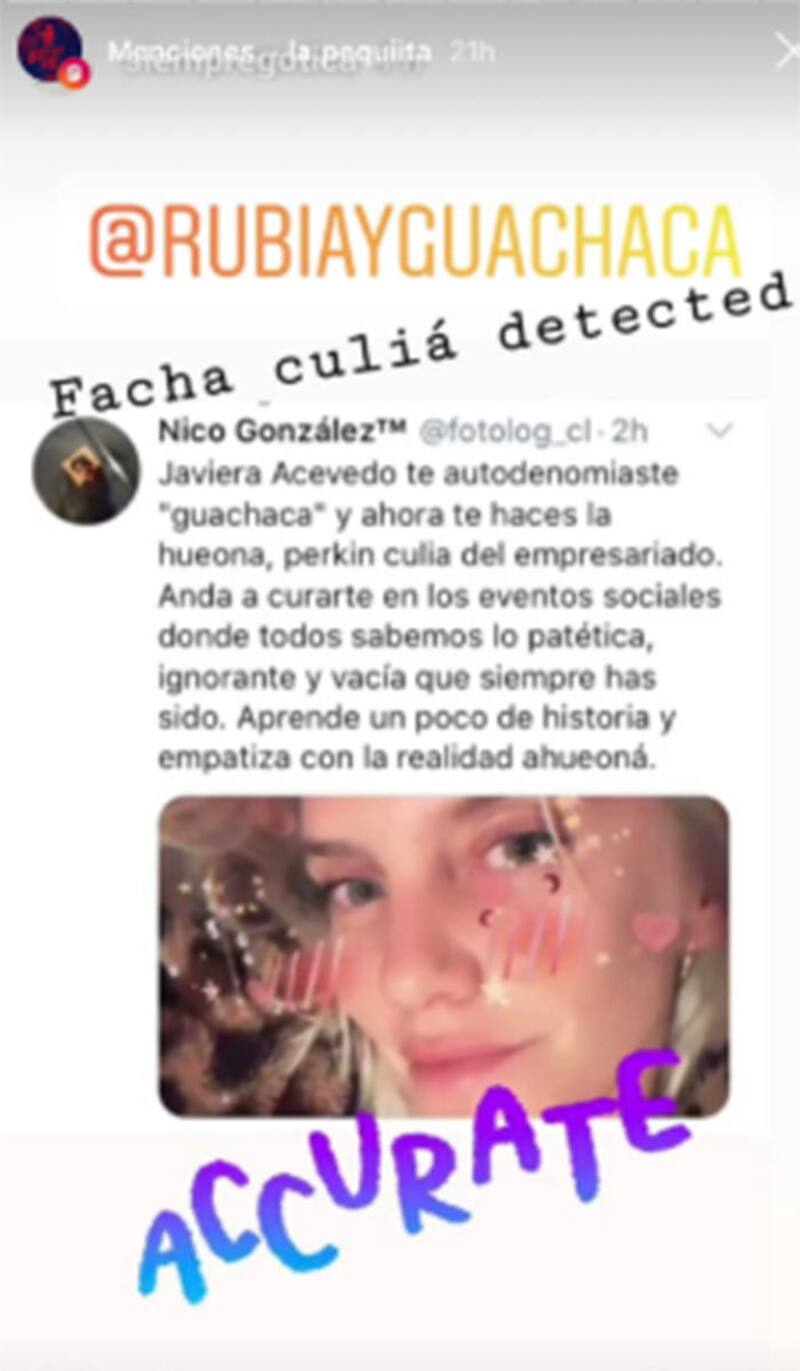"Soy consecuente con mis actos, me nace decir lo que siento cuando quiero. No opinar públicamente lo mismo que todos (no) significa que no me importa el pueblo. Me da rabia la desigualdad, la injusticia y ver sueldos millonarios de parlamentarios. Basta de violencia", posteó Javiera Acevedo en su Twitter, donde publicó algunos de los violentos mensajes que le han mandado.