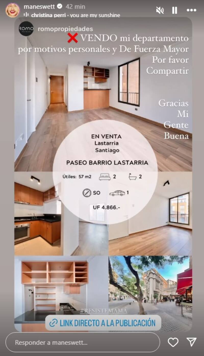 Desde aquellos comentarios han pasado casi dos semanas y este lunes, Mane sorprendió avisando que decidió poner en venta su departamento en el Barrio Lastarria de Santiago.