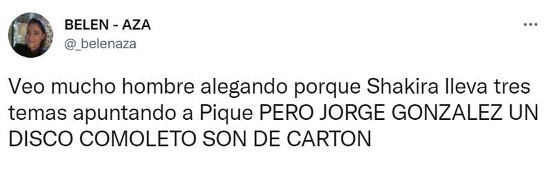 “Jorge González escribió el disco corazones para la ex de su amigo y éste las tuvo que cantar por años! Ahh pero ahí todos calladitos”, “Shakira música de marketing, González música de verdad”, “No comparemos a Jorge Gonzalez con Hechatira”, “Lo que pasa es que, no todos saben que el disco completo habla de una sola persona, la esposa de alguien” y “Escuche bien ese disco, es buenísimo. No como la obsesión de Shakira por Piqué. Malísimo, sólo marketing”, fueron algunas de las reacciones.