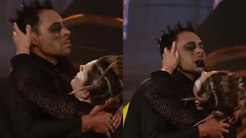 Y por si fuera poco, sorprendió con un beso junto a su pareja de baile, Francisco Solar, lo que provocó los gritos del respetable. Para rematar el momento, la caricia terminó empapada de sangre, tal cual una película de terror.