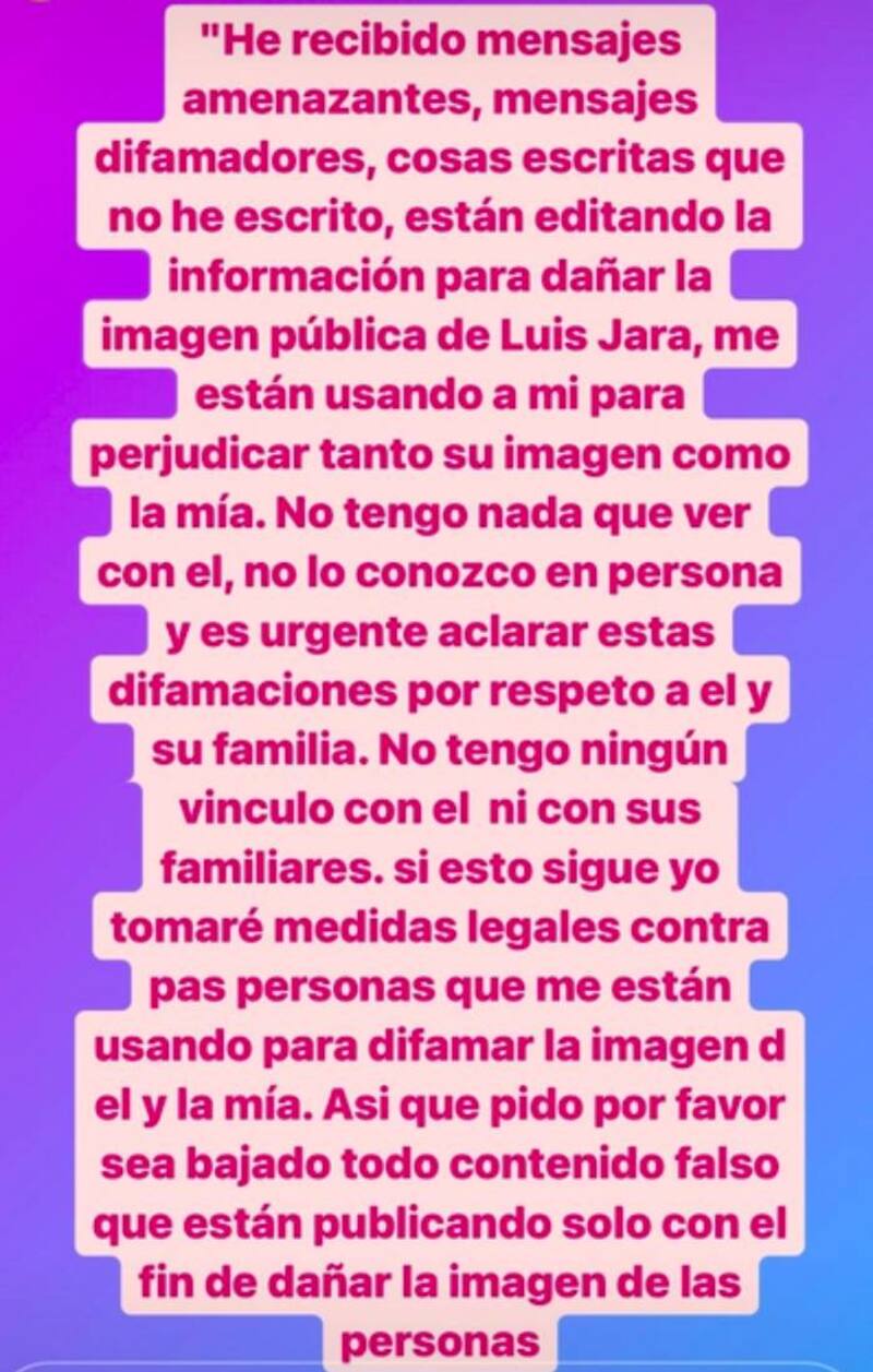 "He recibido mensajes amenazantes, mensajes difamadores, cosas escritas que no he escrito. Están editando información para dañar la imagen pública de Luis Jara. Me están usando a mi para perjudicar tanto su imagen como la mía", lanzó de entrada en sus stories de Instagram.