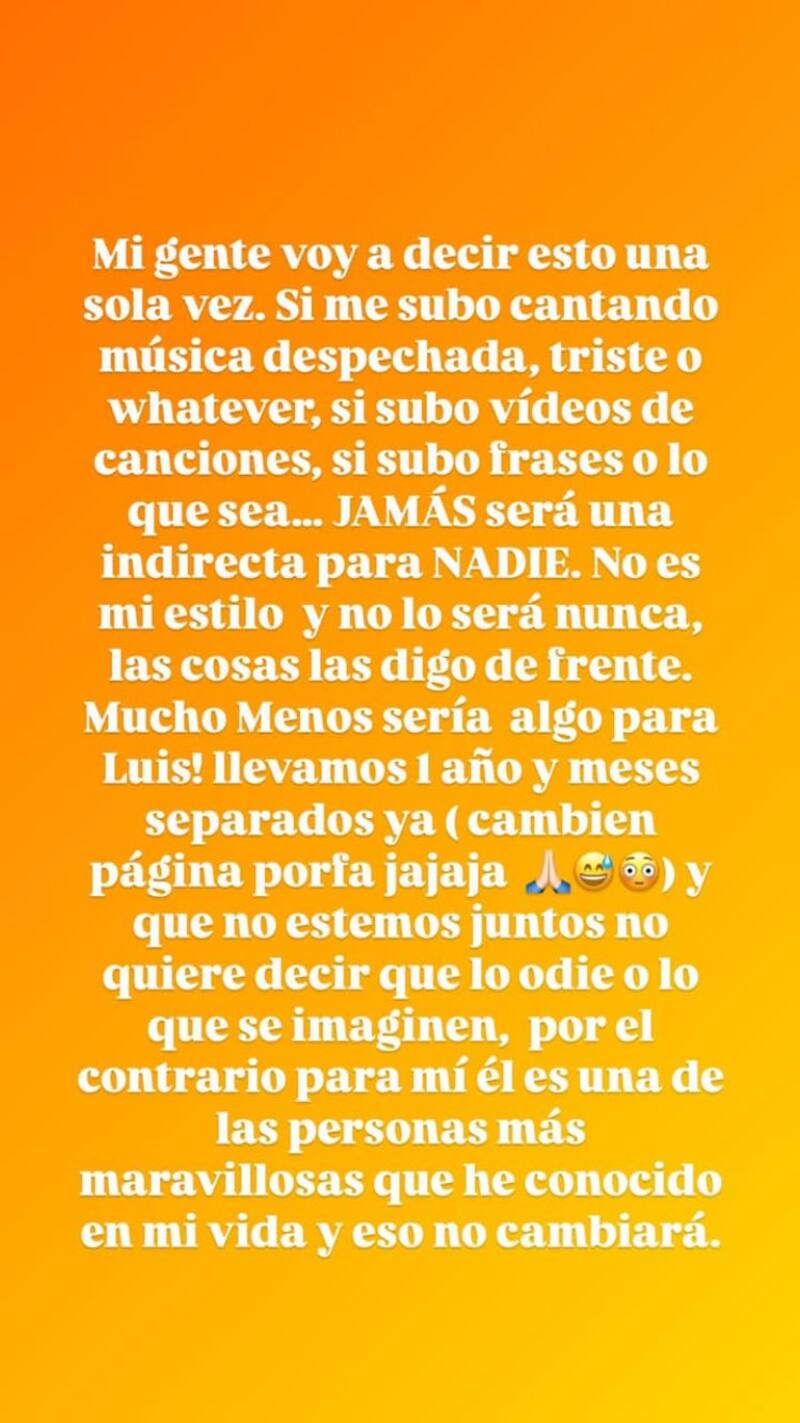 “Mi gente, voy a decir esto una sola vez. Si me subo cantando música despechada, triste o whatever, si subo videos de canciones, si subo frases o lo que sea… jamás será una indirecta para nadie”, afirmó.