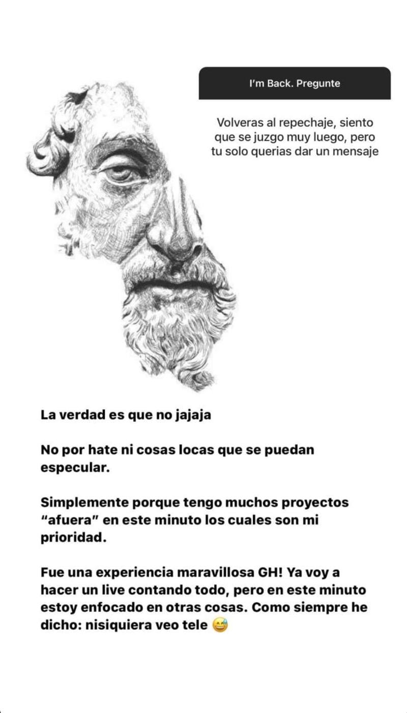 “Fue una experiencia maravillosa Gran Hermano. Ya voy a hacer un live contando todo, pero en este minuto estoy enfocado en otras cosas. Como siempre he dicho: ni siquiera veo tele”, concluyó.
