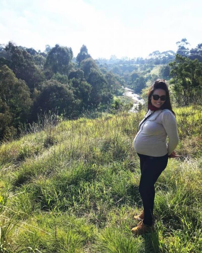 Ahí, se ve a la artista posando en un amplio paisaje verde con su avanzado embarazo.