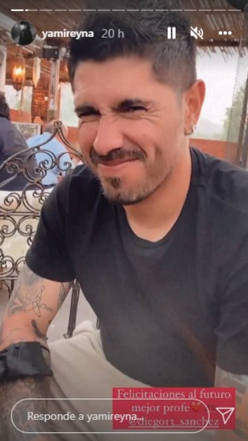 "Felicitaciones al futuro mejor profe, Diego Sánchez… ¿Cómo está festejando el profe? Llénate ahora, porque después a entrenar en casa y hacer clases, chiquito", señaló Yamila Reyna bromeando.