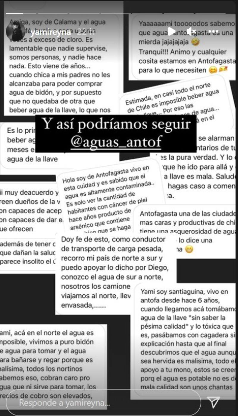 A través de sus historias de Instagram rebatió los dichos de Aguas Antofagasta. “Me parece muy impune el comunicado de dicha empresas donde aseguran la calidad de sus aguas. Mientras que lo primero que te anticipan llegando al norte, es que no consumas agua de la llave por la mala calidad de la misma. Por favor, no sean tan caraduras en subir este tipo de comunicado.”