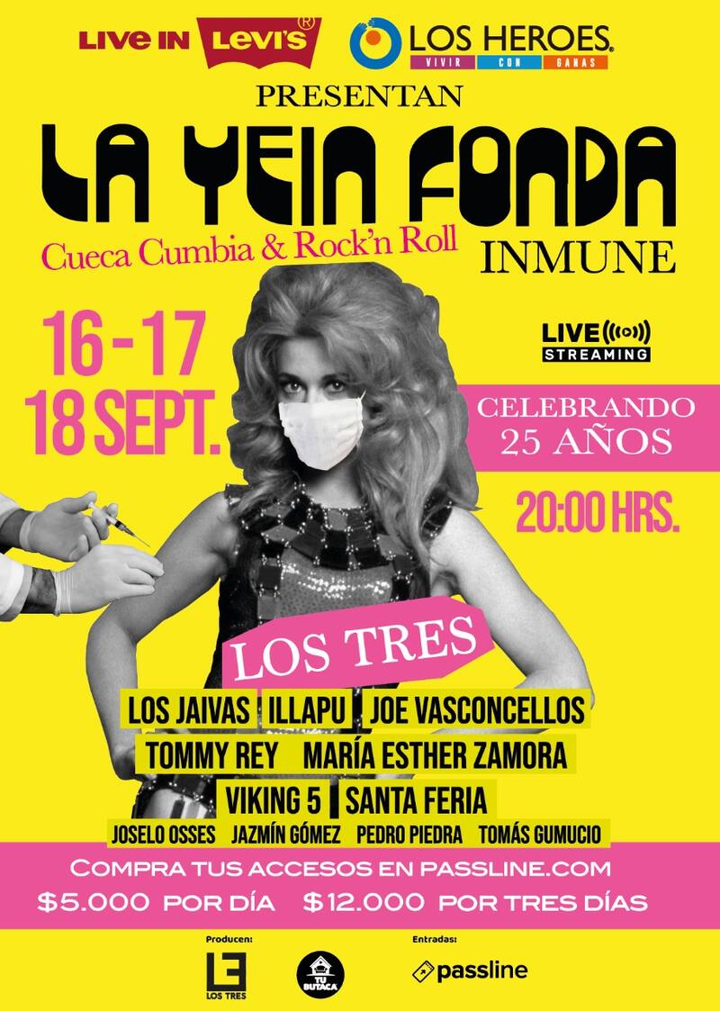 Así lo señaló Álvaro Henríquez, el líder de Los Tres y habitual organizador del evento, durante el lanzamiento oficial de la Yein Fonda este miércoles en el estudio 9 de TVN. Instancia en que también participaron María Esther Zamora, Mario Mutis y Juanita Parra de Los Jaivas, Ariel Carrasco y Rodrigo González de Santaferia