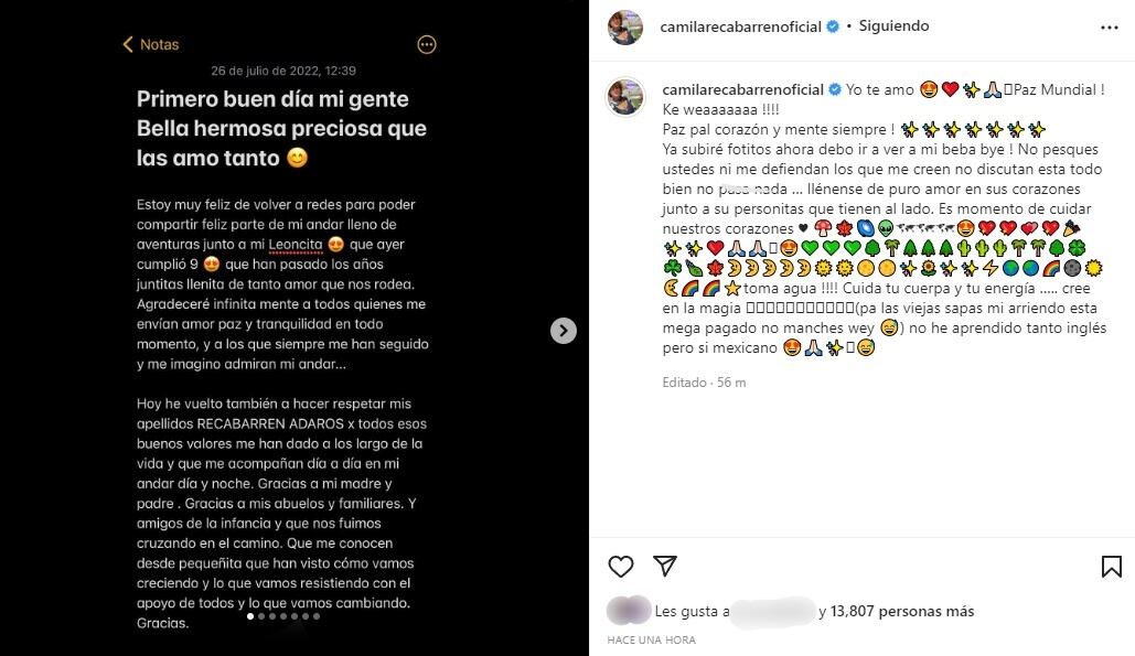 “Agradeceré infinitamente a todos quienes me envían amor, paz y tranquilidad en todo momento, y a los que siempre me han seguido y me imagino admiran mi andar. Hoy he vuelto también a hacer respetar mis apellidos Recabarren Adaros, por todos esos buenos valores que me han dado a lo largo de la vida (…) y a la bella que hoy me acompaña y a mis polol@s que he tenido. Gracias infinitas por enseñarme y hacerme crecer más aun”, reflexionó la influencer.