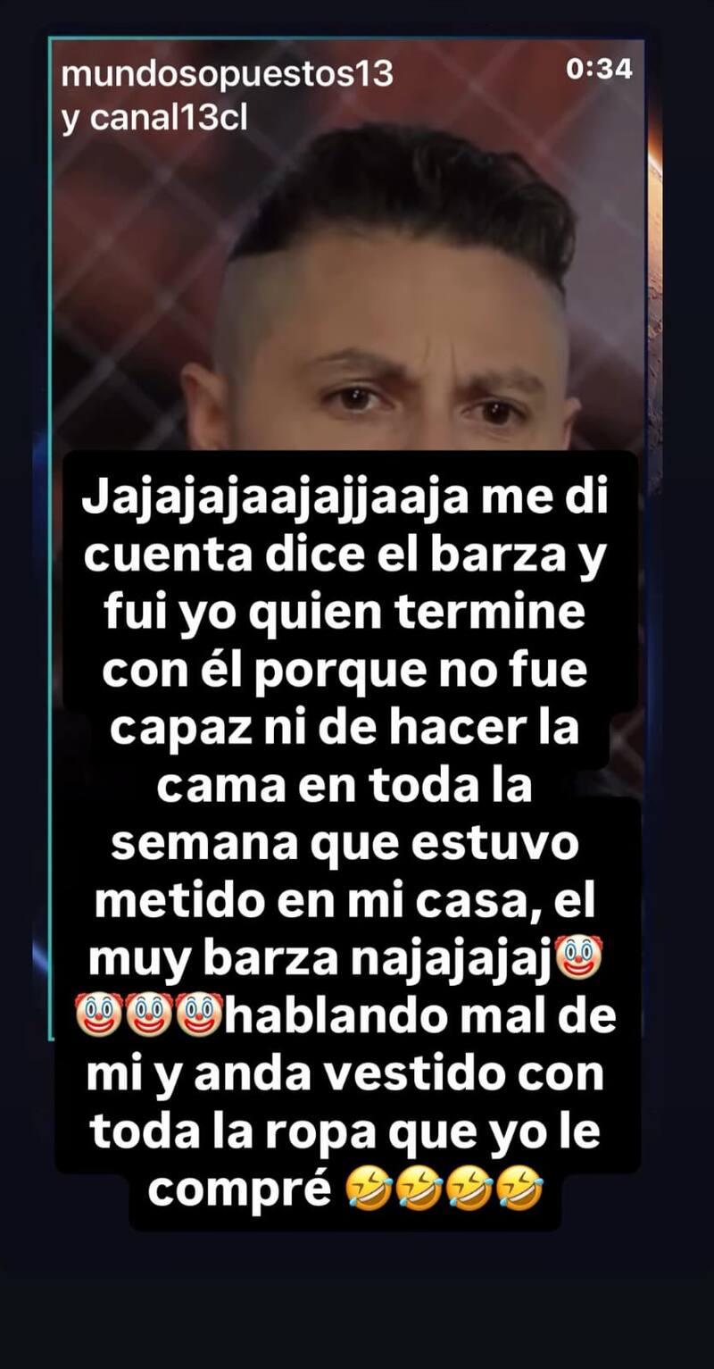 “Me dí cuenta dice el barza y yo fui quien terminó con él porque no fue capaz ni de hacer la cama en toda la semana que estuvo metido en mi casa, el muy barza”, escribió a través de sus historias de Instagram.