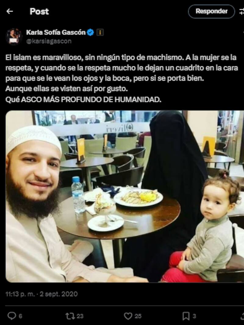 Pero, ¿qué decían los tuits de Karla Sofía Gascón? El 2 de julio de 2016, escribió: “El Islam se está convirtiendo en un foco de infección para la humanidad que hay que y curar urgentemente”.