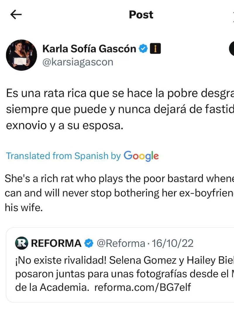 En otro de los tuits atacó a su compañera de reparto, Selena Gómez: “Es una rata rica que se hace la pobrecita cada vez que puede y que nunca dejará de molestar a su exnovio y a su esposa”.