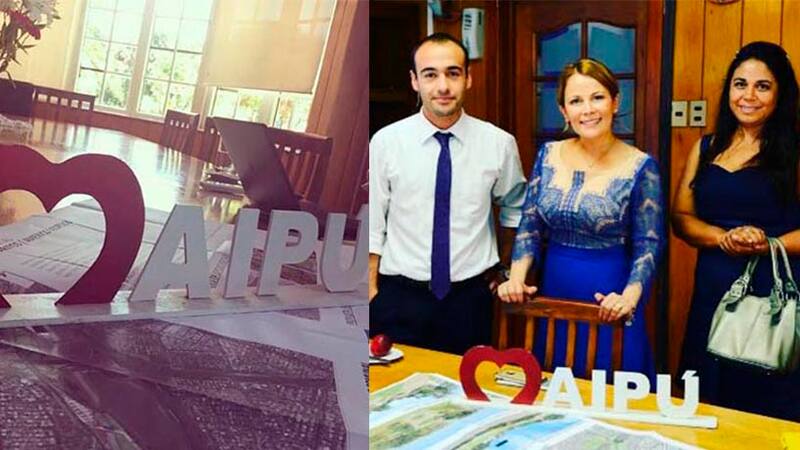 La edil subió a su cuenta Instagram cathy_barriga una imagen de una reunión de trabajo donde se muestra una especie de monumento, la palabra Maipú transformada en una estructura metálica donde la "M" forma un corazón.