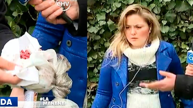 Notero matinal CHV: “¿Lo puedes mostrar, Jorge (camarógrafo)?. Es lo que genera el nerviosismo de Chriss. Encontramos esto recién, cuando Chriss nos iba a abrir la puerta. Es una bolsa con veneno para ratones. ¿Eso se lo lanzaron a tus perros? Mira, lo tiene Matías…”
