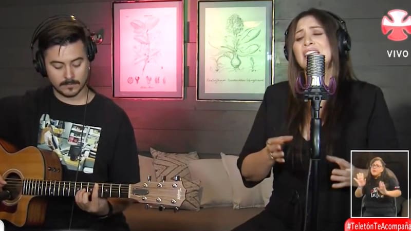 La cantante nacional de 54 años, desde su casa en Santiago, interpretó su tema La Fuerza del Amor junto a su hijo Jorge Saint-Jean, de 25 años, quien la acompañó con la guitarra.