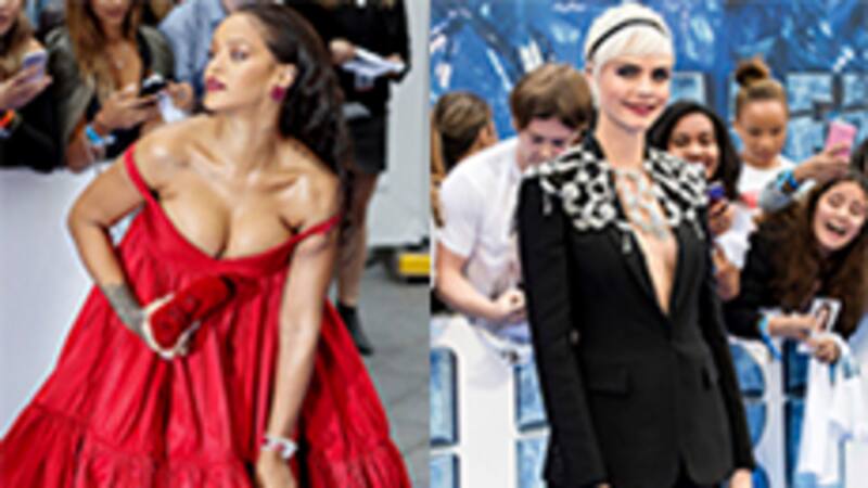Rihanna con un escote a punto de explotar y la modelo Cara Cara Delevingne con un capelet de cristales, en la premiere de Valerian en Londres.