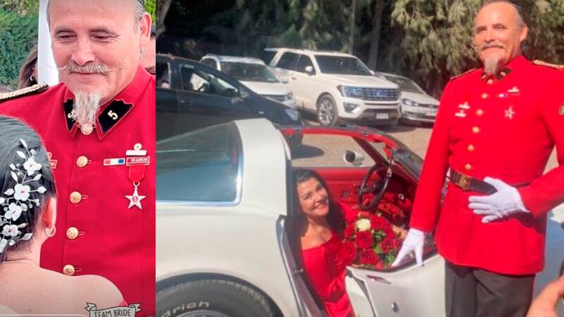 Vásquez, quien es voluntario de Bomberos de San Bernardo, se casó vistiendo el uniforme de la institución, en tanto Sepúlveda combinó tenida, con una blusa roja roja y pollera blanca.