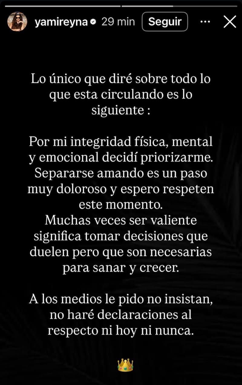 “Por mi integridad física, mental y emocional decidí priorizarme. Separarse amando es un paso muy doloroso y espero respeten este momento.