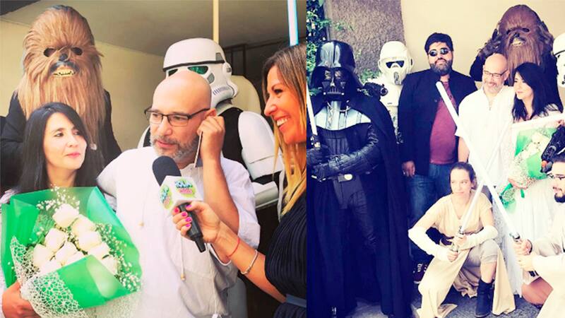 Por eso es que en las fotos que el novio subió a su cuenta Instagram rinconsalfate están rodeados por Chewbacca, Darth Vader y otros personajes de la Guerra de las Galaxias -MIRE AQUI EL VIDEO-.