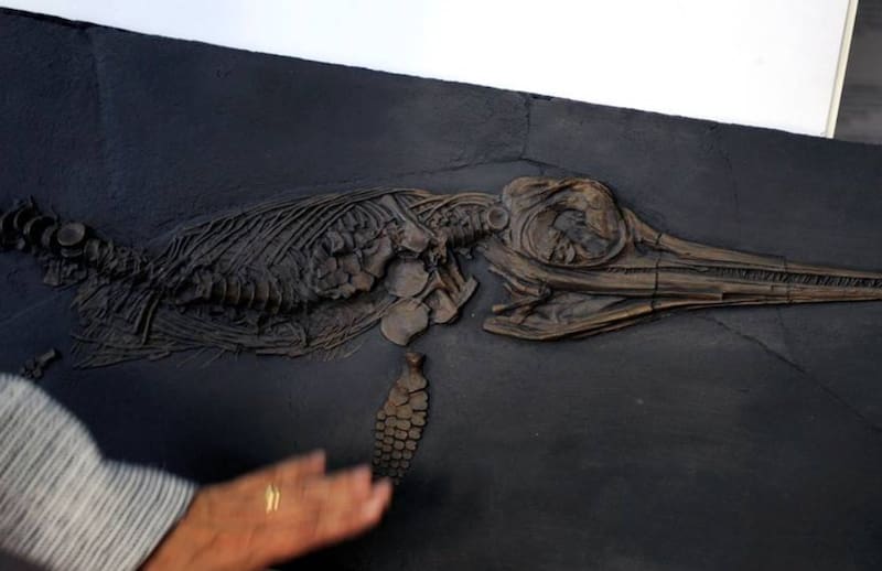 De la época bajo el agua han hallado una gran variedad de peces que, a su vez, eran el alimento de estos reptiles marinos, “porque hemos encontrado contenido estomacal de peces en los ictiosaurios y fecas fosilizadas con escamas”, agrega.