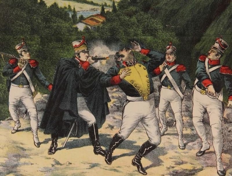 El asesinato de Manuel Rodríguez. Grabado de Luis Fernando Rojas publicado en La Lira Chilena, 1904.[/caption]
