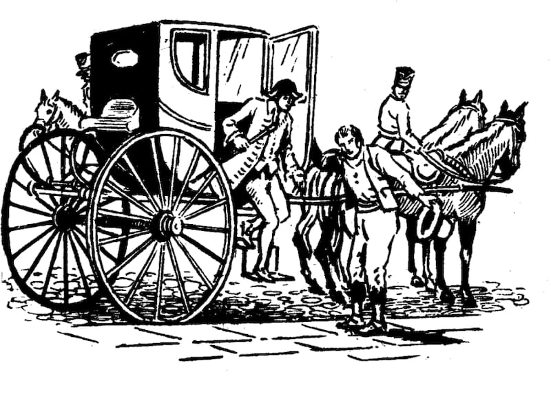 Manuel Rodríguez abre el carruaje de Marcó del Pont. Una hazaña que no tiene sustento documental y corresponde a la tradición oral.[/caption]
