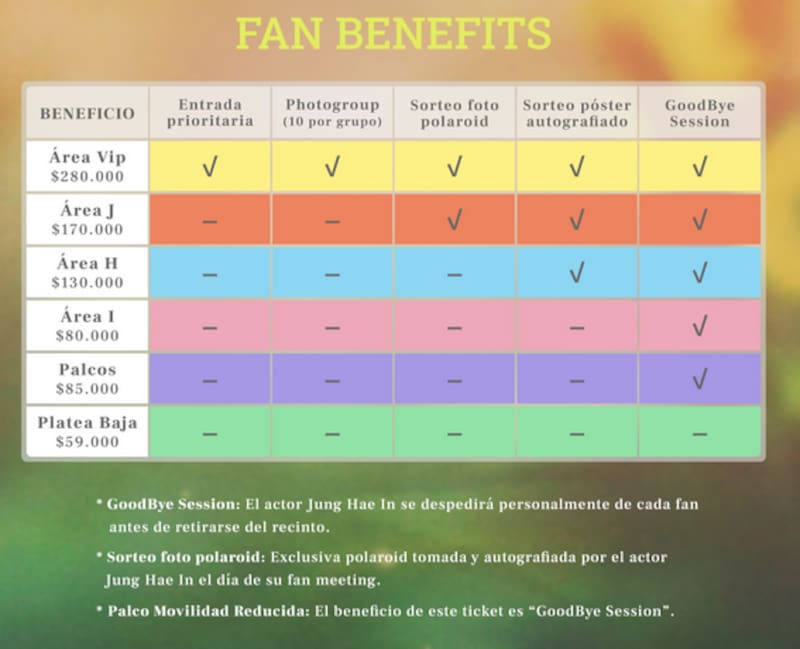 Las entradas de área VIP incluyen entrada prioritaria, photogroup (10 personas por grupo), sorteo foto polaroid, sorteo póster autografiado, goodbye session.