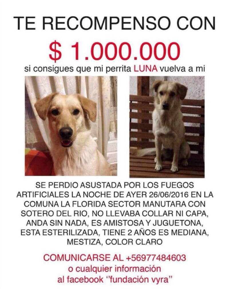 "Desde ese entonces, no hemos dejado de buscarla. Luna fue recogida de la calle por medio de la fundación 'Vida y respeto animal' y la adoptamos cuando tenía 2 meses. Con nosotros estuvo 1 año y ocho meses y es como nuestra hija", sigue su desesperado papi, que está tan desesperado que sacó la billetera y ofreció senda recompensa por la can.